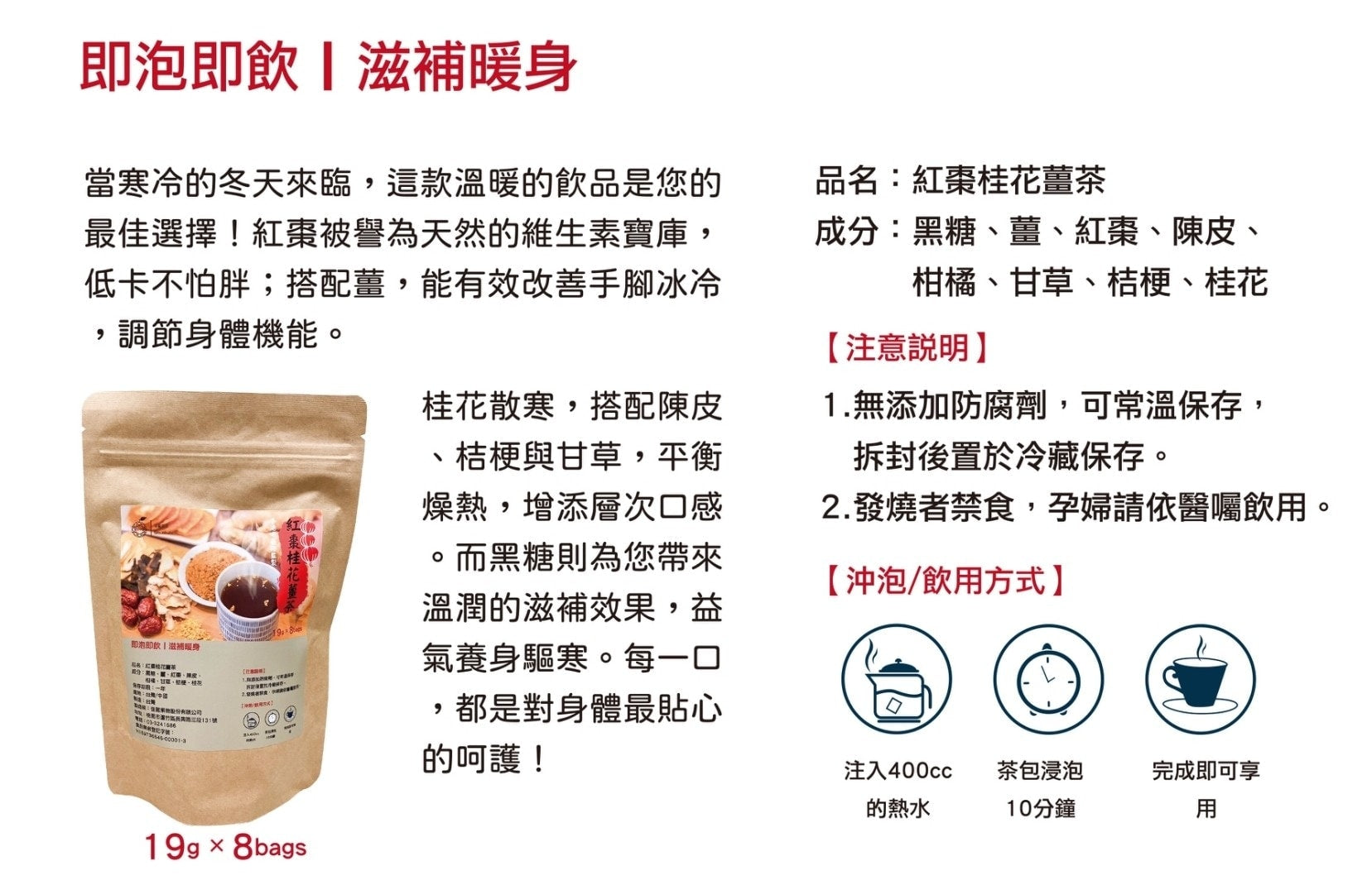 成份: 黑糖, 薑, 紅棗, 陳皮, 柑橘, 甘草, 桔梗, 桂花