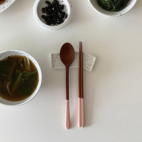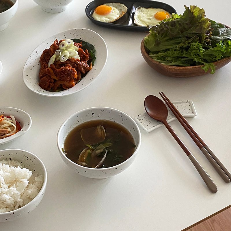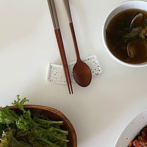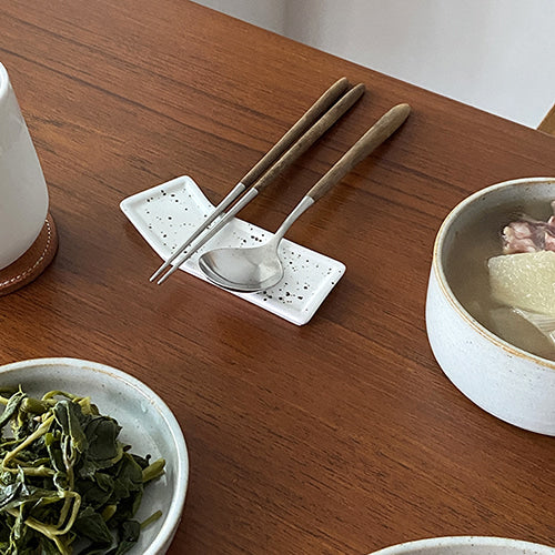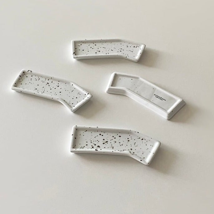 韓國Pola at home 的Urban 系列以半光白釉燒製而成,並以鐵針勾勒出可愛的黑色斑點,每個皆為獨一無二的陶製品。此款小巧輕薄的彎折餐具架,也是迷你托盤,微高起的邊緣能更好地防止餐具滑落,彎折設計也提供足夠的空間放上筷子、湯匙等餐具。由於採手工上釉的方式,每款點點花紋的數量及密集度都有所差異,因此就算整個餐桌都是同系列的食器也不會感到眼花撩亂,甚至帶來純白低調的和諧感,是近年非常受歡迎的簡約韓風。