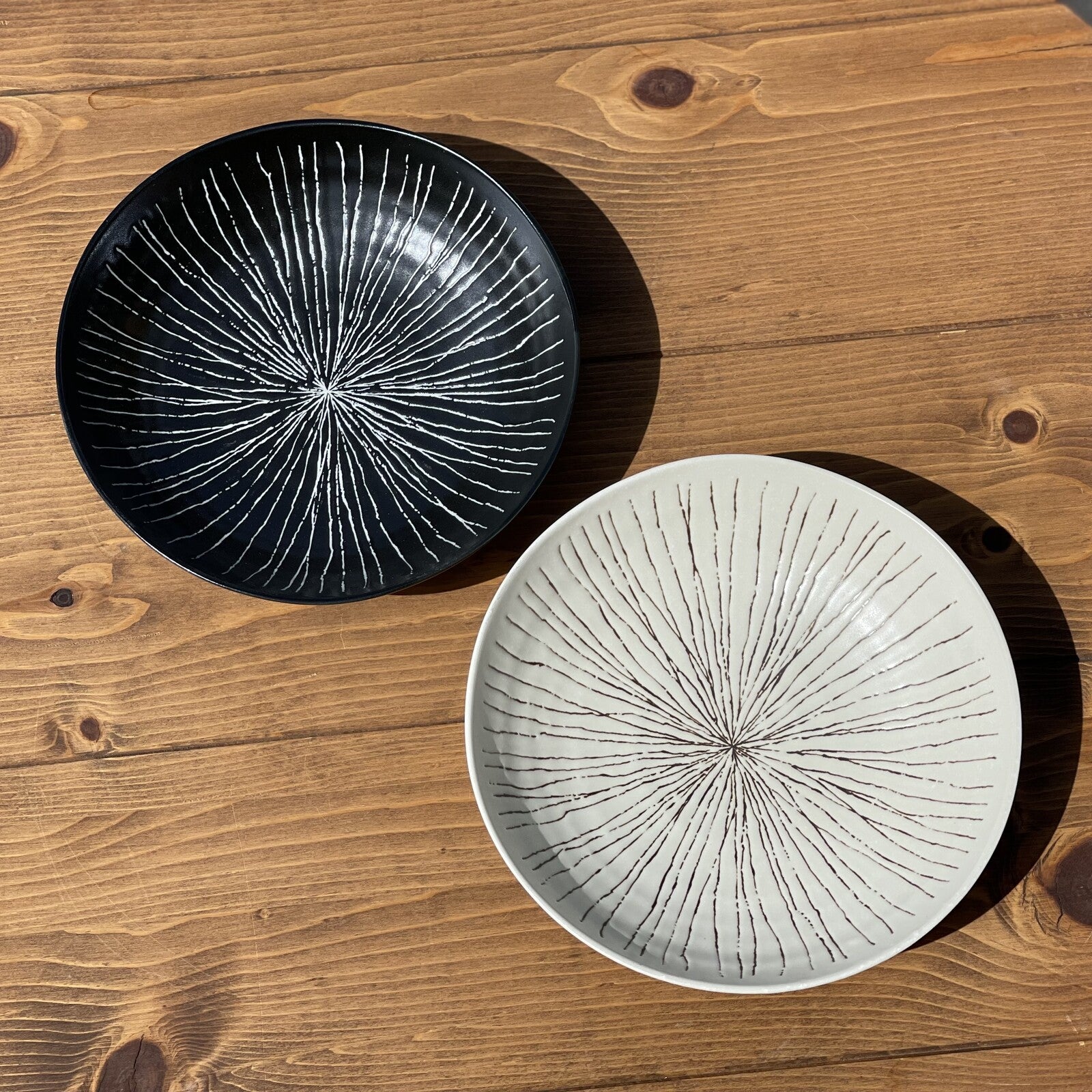 此款深盤具有十分獨特的表達,在黑釉或白釉上,以盤中央為起點,刮掉釉料,向外呈現出不規則的放射條紋圖案,就像一副很有張力的藝術品,為餐桌擺盤帶來不一樣的視覺效果!