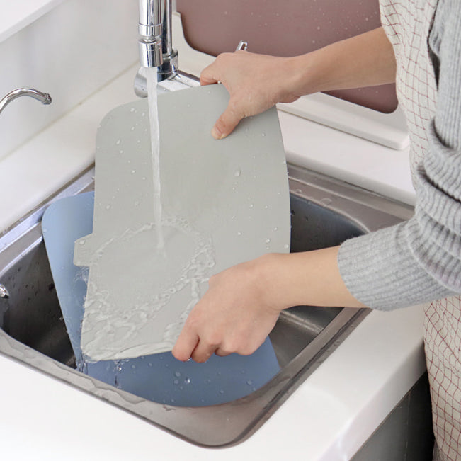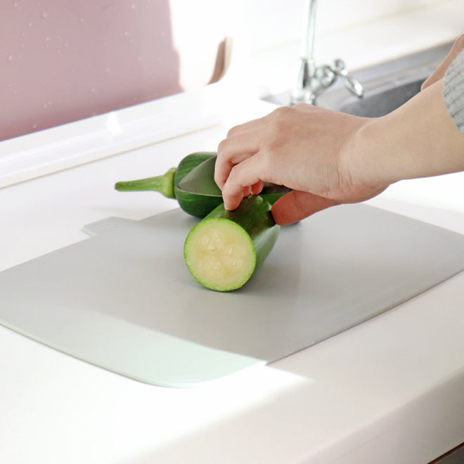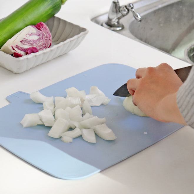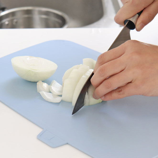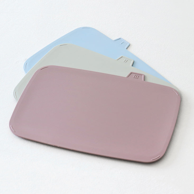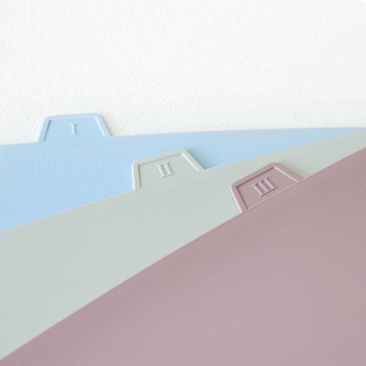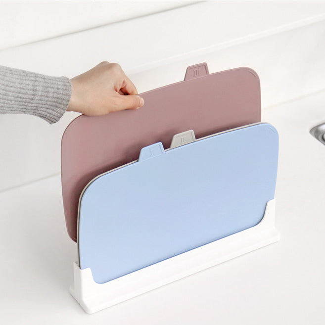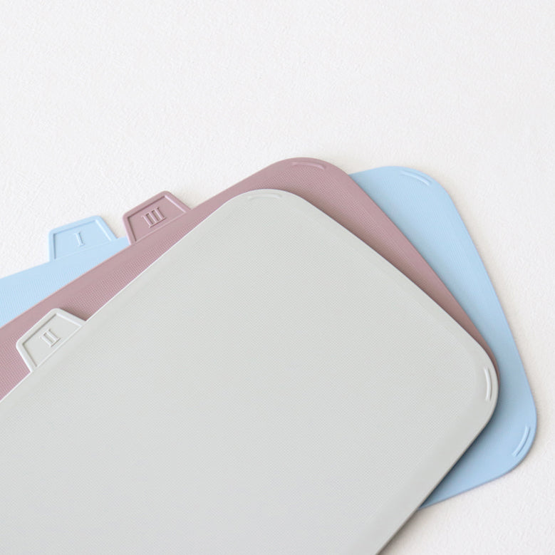 A set of 3 with different colors, this cutting board features a folder tag-like design at the top for easy categorization based on food type, ensuring hygiene and freshness in your cooking. The surface is treated with a special embossed texture to prevent knife marks. There are raised lines on all four corners to prevent water droplets from spilling over, maintaining a tidy kitchen. The upright design with a base makes it clean, convenient to use, and does not take up much space.