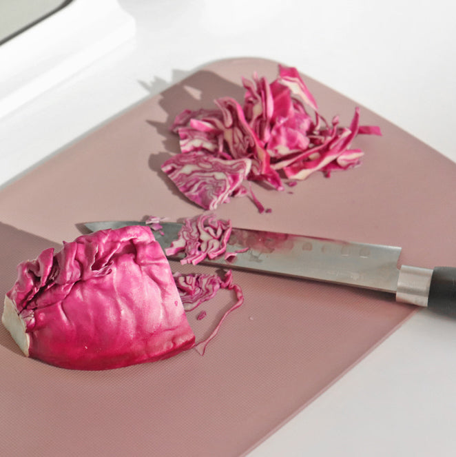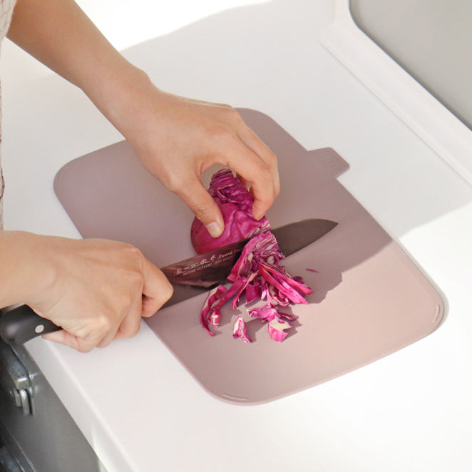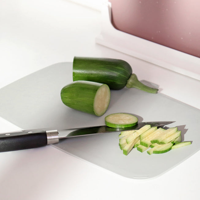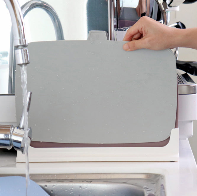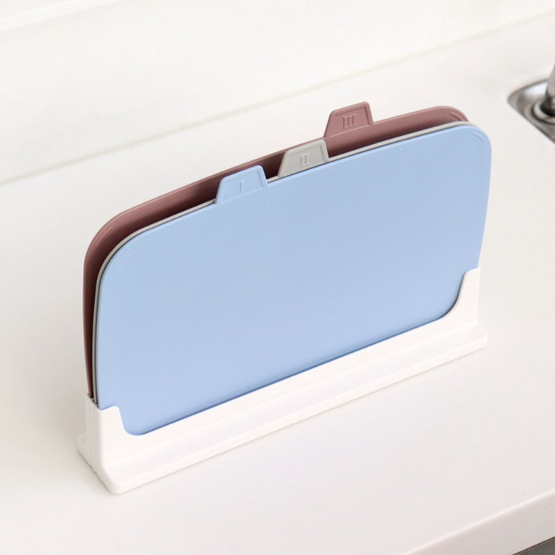 以三種顏色組合打造,這款砧板在上方設計了像是資料夾的突出標籤,方便你根據食材類型獨立使用,保持料理的衛生新鮮。表面採用特殊的壓花紋路處理,可避免留下切割刀痕,四個邊角更具有突起的擋線,防止水珠滾出,維持廚房的整潔度。附底座的直立式設計,令使用上更乾净、順手,且不占空間!
