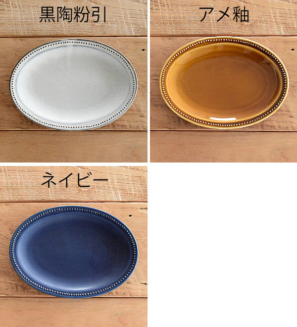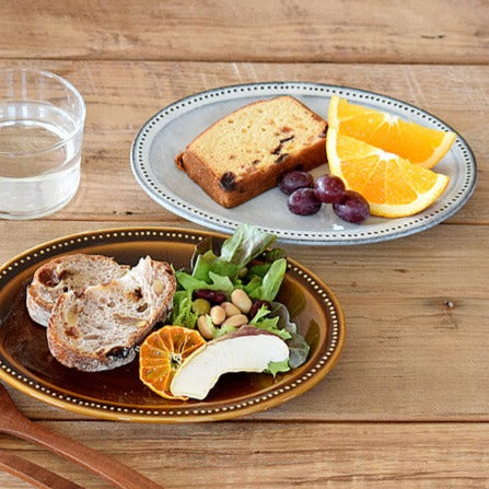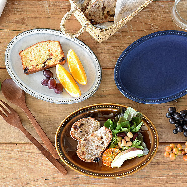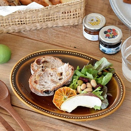 This oval plate comes from a stylish series with an antique vibe that emphasizes soil and glaze. The delicate polka dots are like pearls surrounding the rim, which make it a special texture to the touch. With its 8.5" oval shape, this plate is perfect for breakfast, salad, and sweets. There are three fashionable colors to choose from, and bring out the beauty of the food.