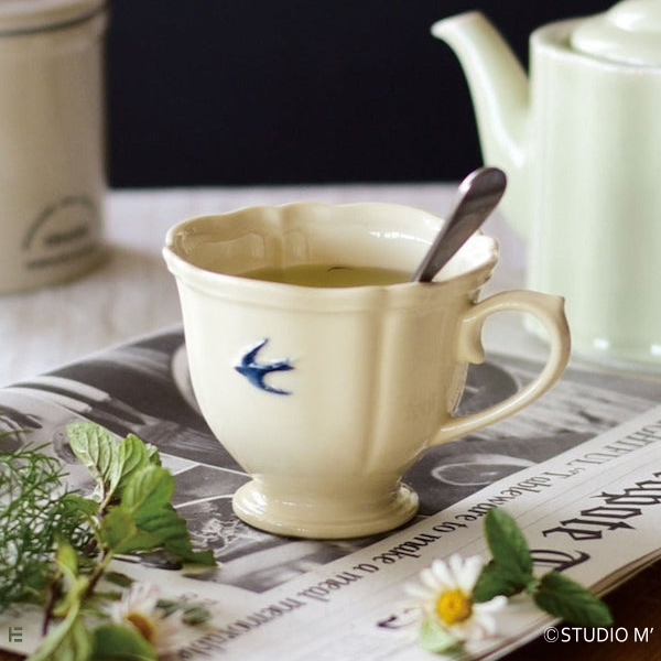 An early bird is a person who gets up or arrives before the expected time. The concept of the Early Bird series is to motivate you to rise a little earlier in the morning, make yourself an enjoyable breakfast, and start your day off with the right foot. This cup has a beautiful outlook. The cloud-like elegance of the flowery edge, coupled with the flying swallow, symbolizing auspiciousness, makes you feel free and energetic. With its small size and lightness, it is best suited for serving coffee, milk, hot tea, brining you a good mood of the day. Ema’s Table also has the plates in the same series for sale.