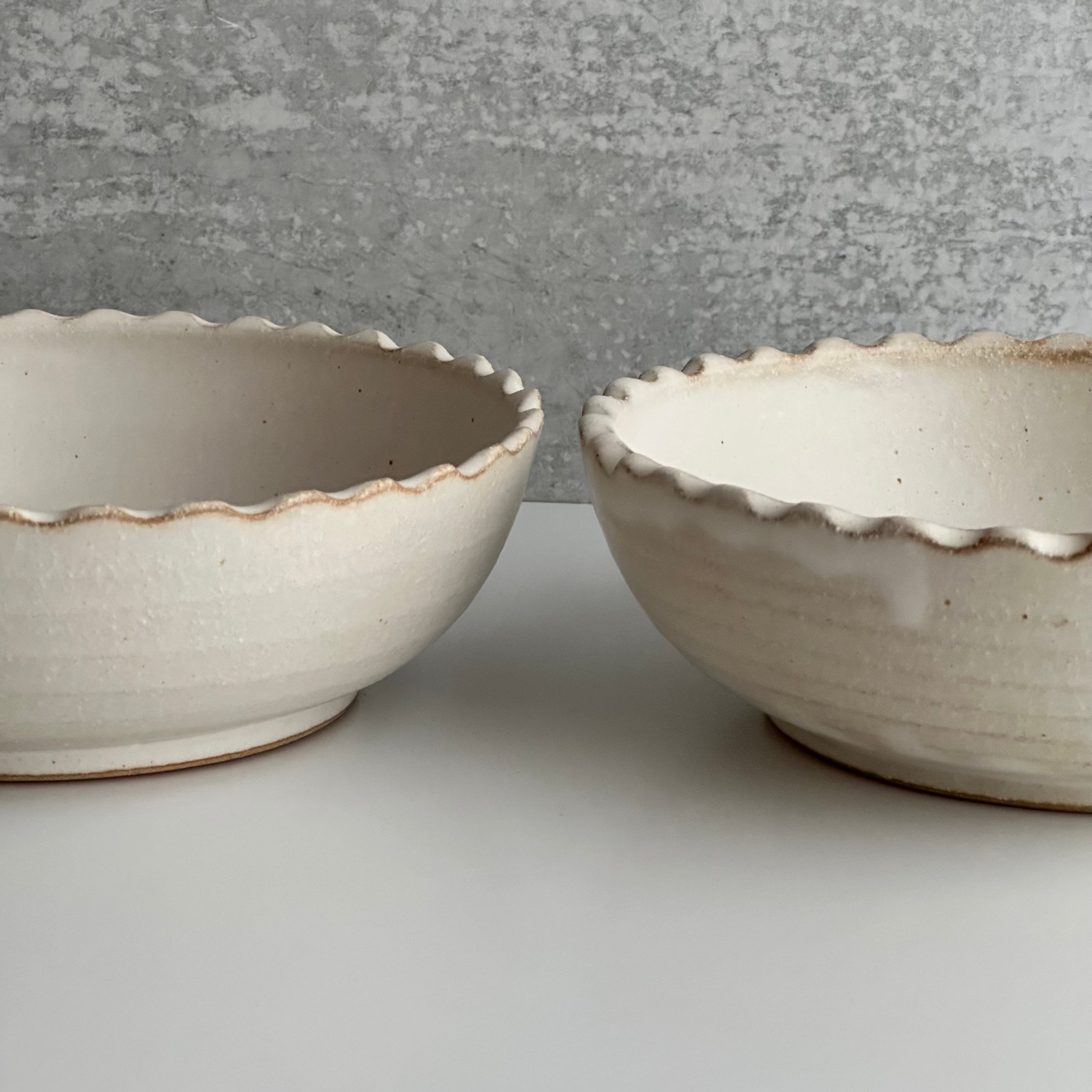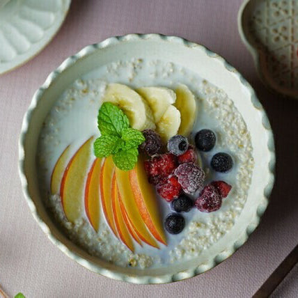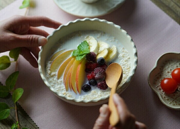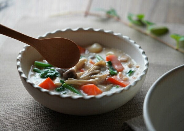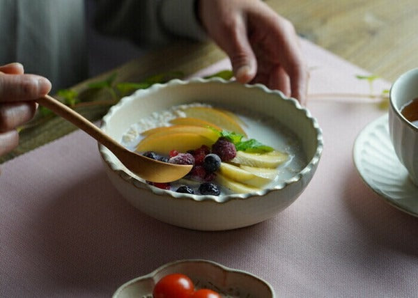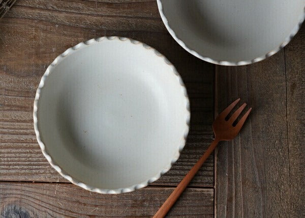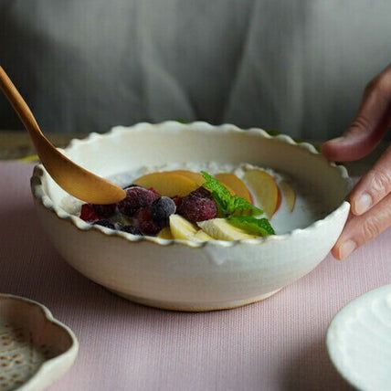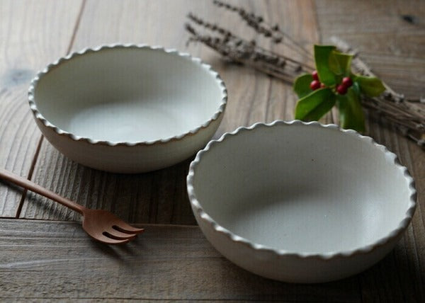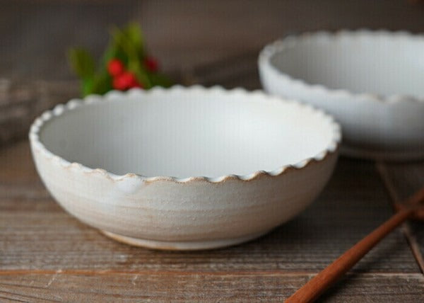 This Mashiko-yaki shallow bowl is handcrafted by skilled Japanese artisans, featuring a lace-like rim that adds an elegant touch. Its gentle texture and natural style reflect the warmth of handmade pottery. Measuring approximately 16 cm in diameter, it’s perfect for serving salads, simmered dishes, cereal, or stews. The natural ivory glaze, with its soft gradations, gives it a rustic charm—an ideal companion for everyday meals.