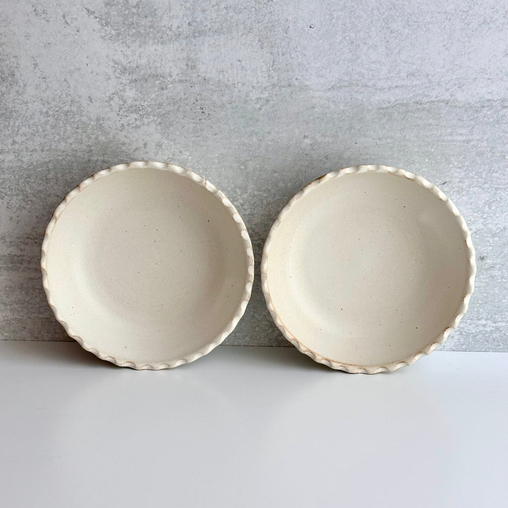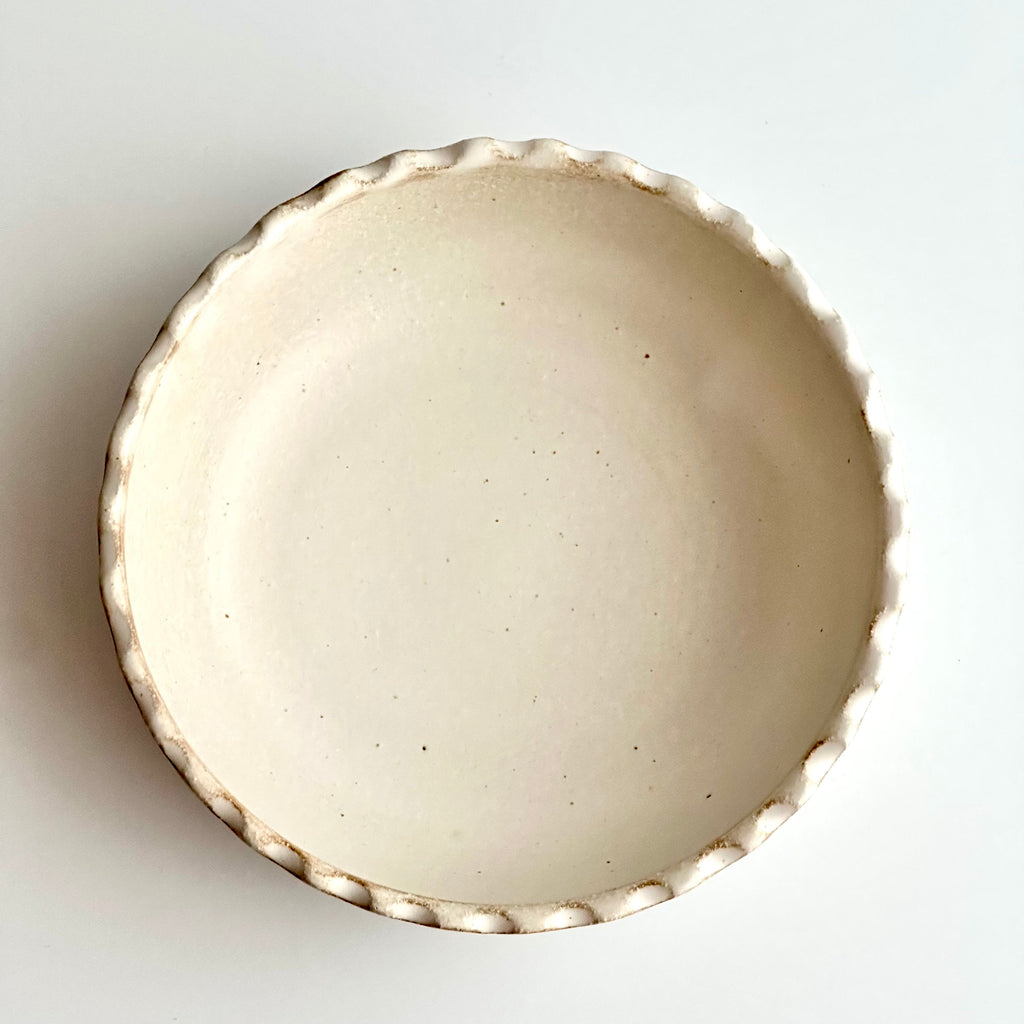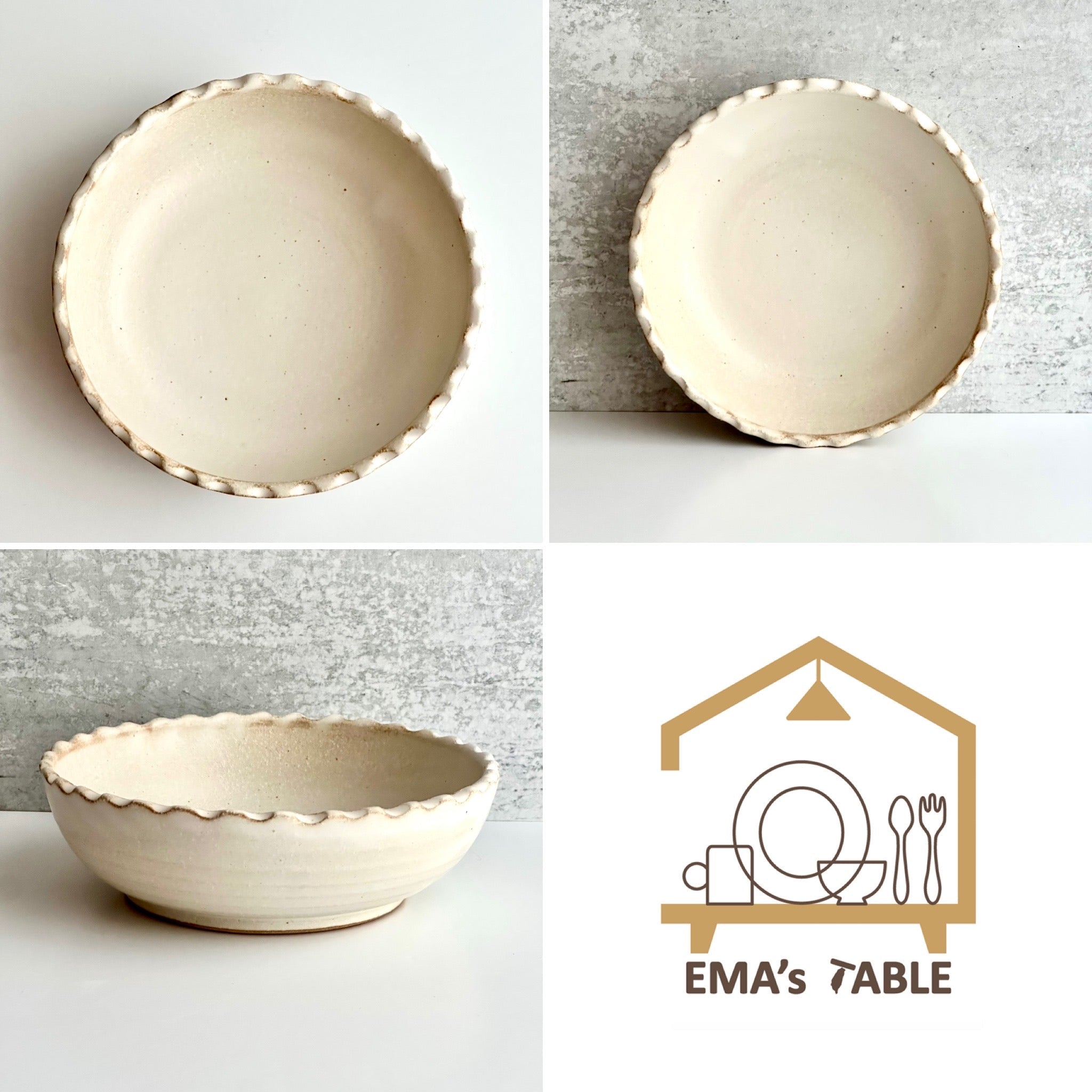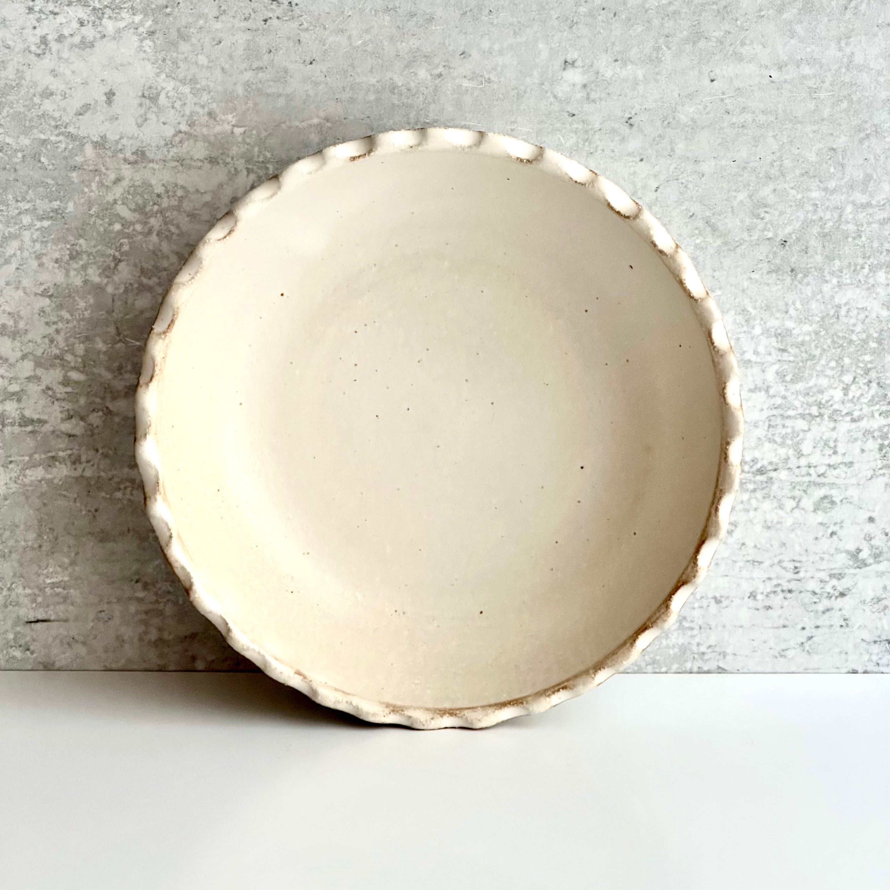 這款益子燒淺碗由日本職人手工製作,以蕾絲般的邊飾展現優雅質感,散發溫潤手感與自然風格。16 cm 尺寸適合盛裝沙拉、煮物、穀片或燉菜,自然象牙色與釉藥濃淡交錯,呈現樸實之美,是日常用餐的溫馨良伴。