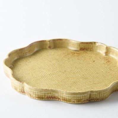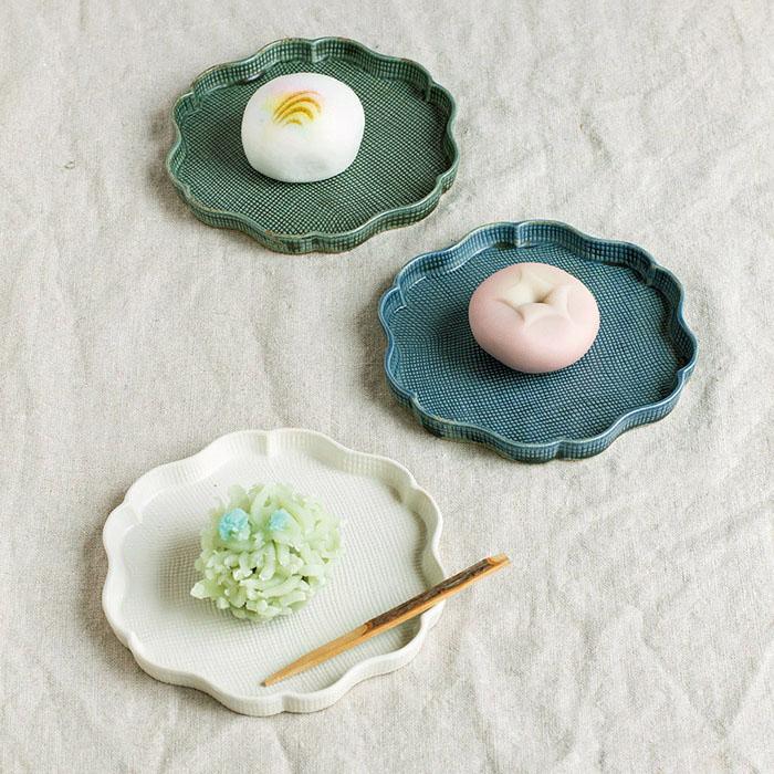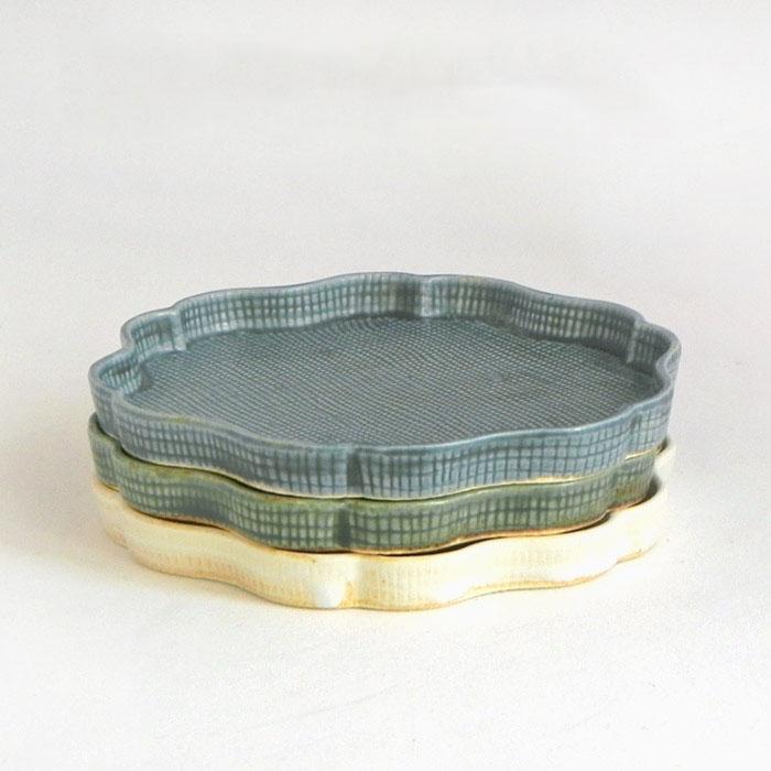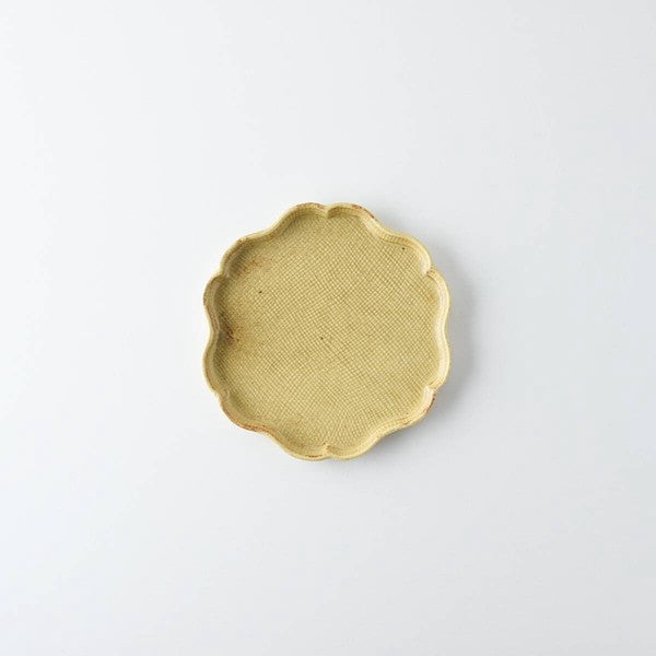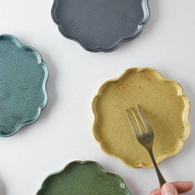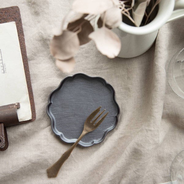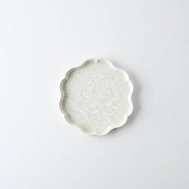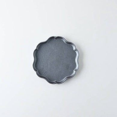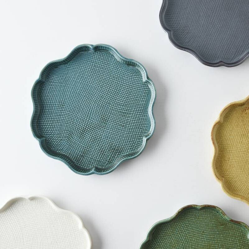 Newly designed in 2020, this Mino ware plate is manufactured with the Tatara method. The delicate cotton texture pattern, beautiful flower shape, and the calm tone make it look special and tasteful. Being small and flat, it is great for serving appetizers, desserts, fruits and snacks. Use it to lay out your usual dishes beautifully like a painting and enjoy the table art. Available in 5 colors, it also comes with an individual box that is perfect for gifts.