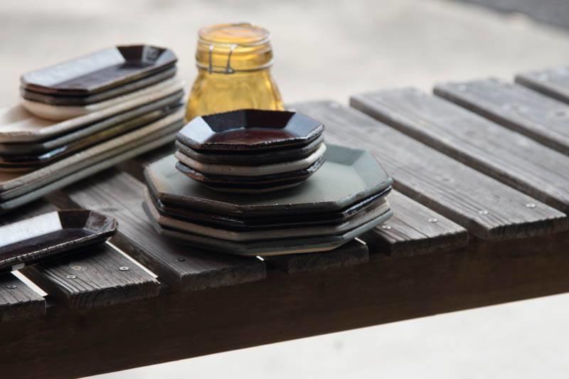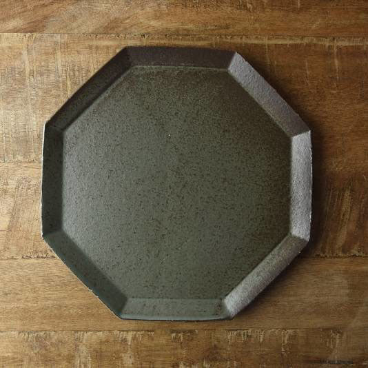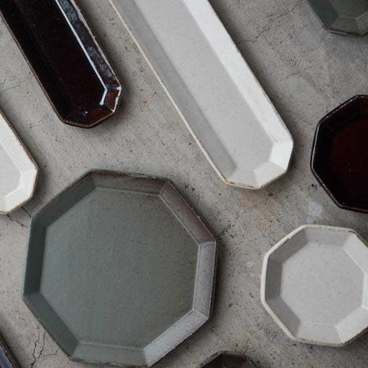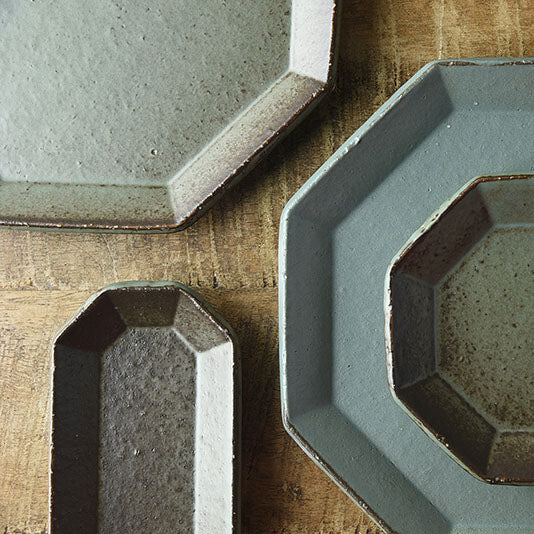 At first glance, this Mino ware plate looks like an octagonal industrial design, but the special soft corners finished by hand gives you a warm impression. Due to the wide range of baked colors, each plate has its own unique and rich colors, brown when it is thin, and grayish green when thick. There are three sizes to choose from. The flat shape makes it easy to stack up and it can be used in combination with various small plates as a one-plate or tray.