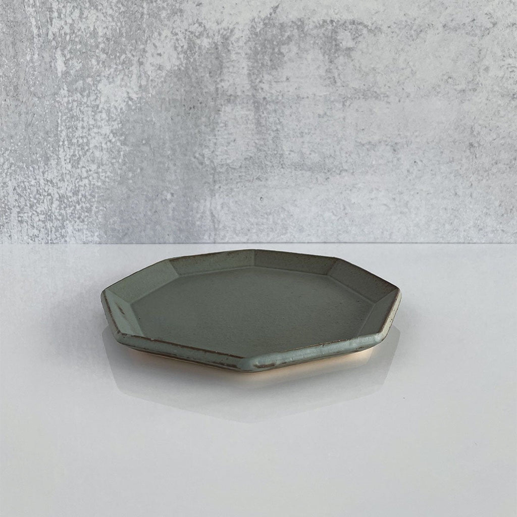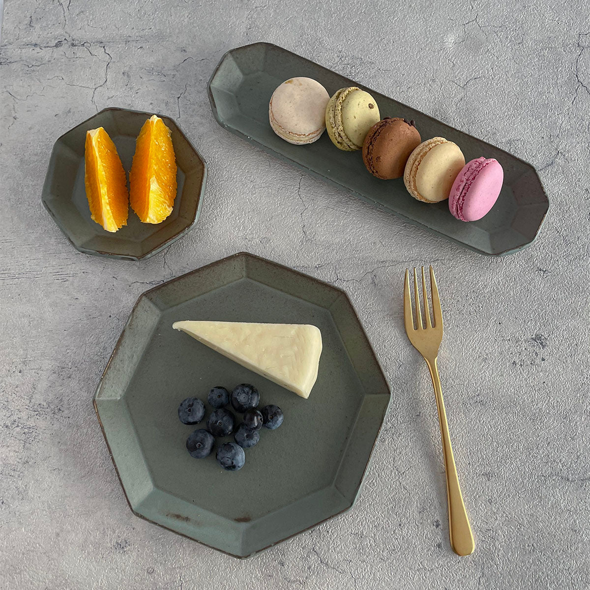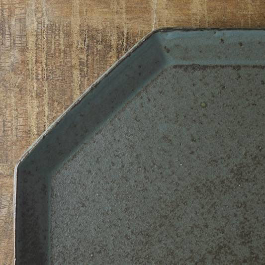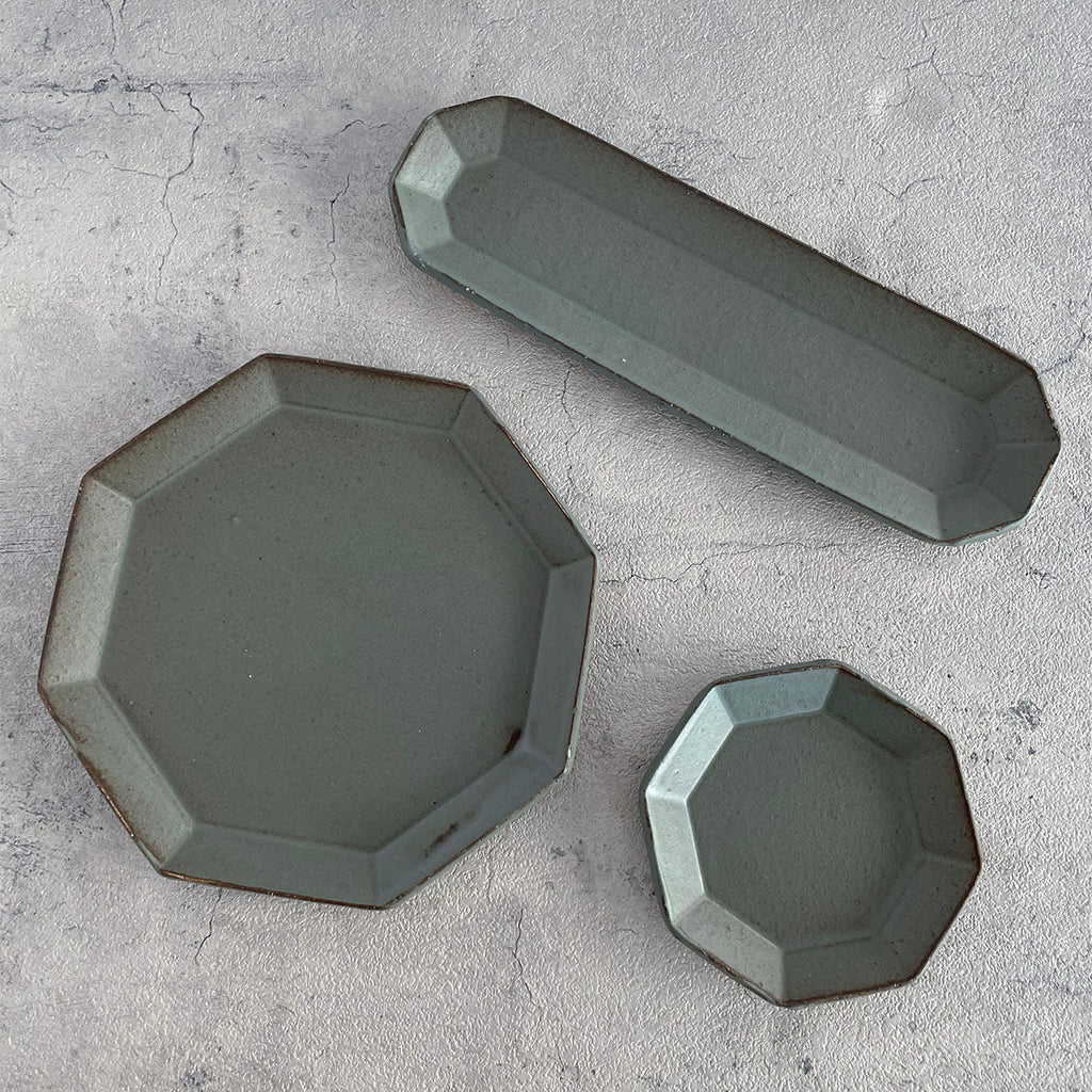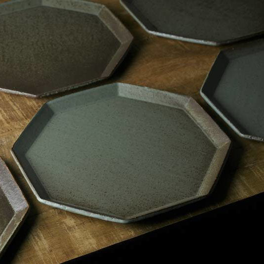 此美濃燒盤子乍一看像是八角形的工業設計,但手工製作的獨特柔軟邊角給人以溫暖的印象。由於燒製的顔色範圍很廣,每一個都有其獨一無二的色彩和光潔度,薄時呈棕色,厚時呈灰綠色,加上特殊的釉面處理,整體變化豐富,可欣賞到細微的不規則紋理。供有三種尺寸選擇,扁平形狀易於堆疊,方便組合使用,適合搭配各種食物、各種風格的餐桌擺設,時尚高雅!