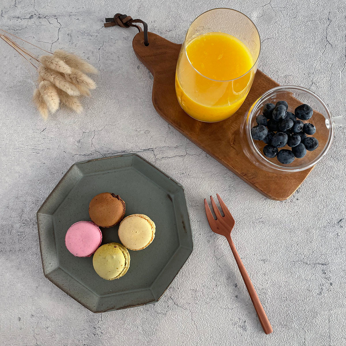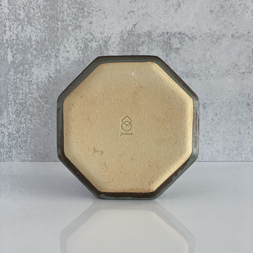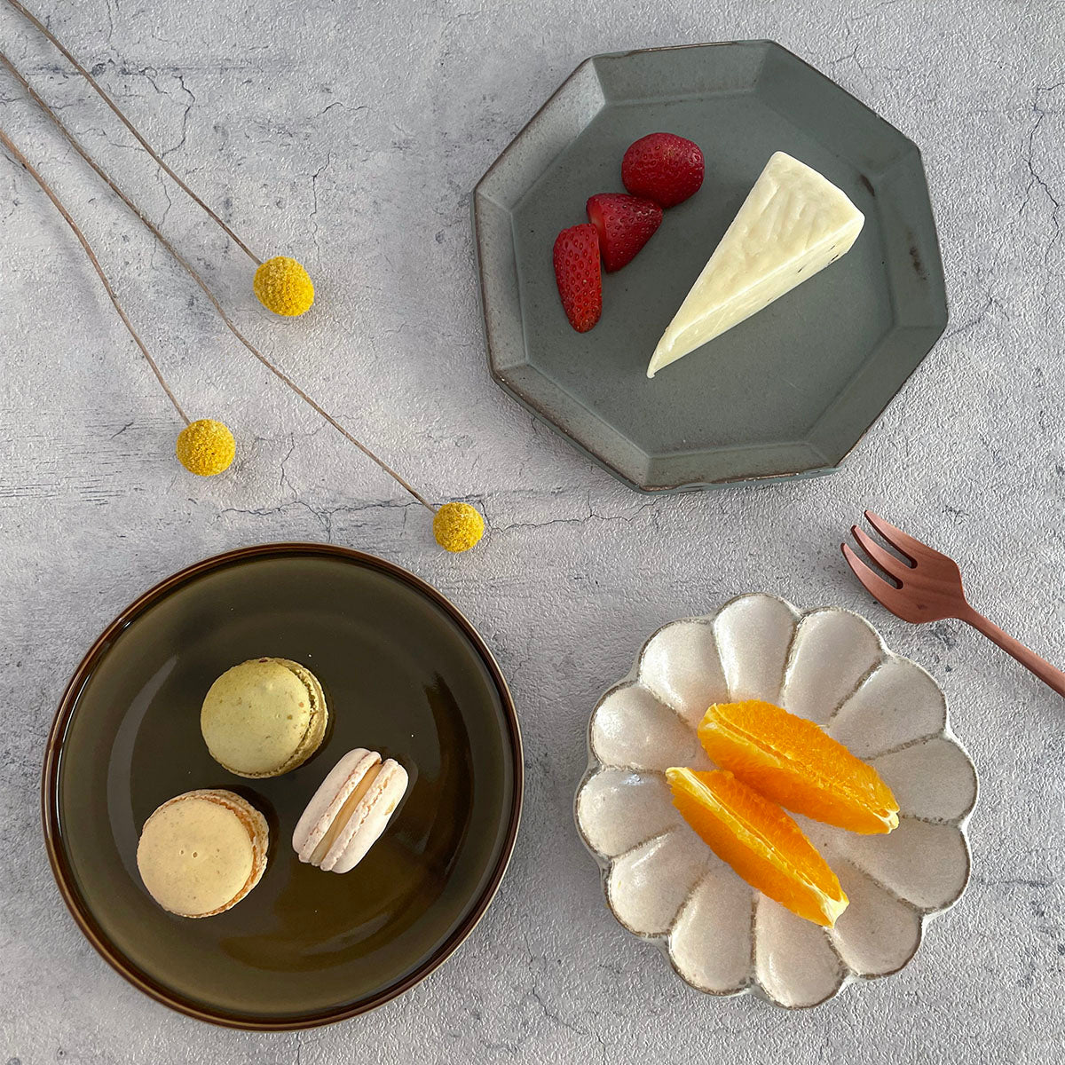 此美濃燒盤子乍一看像是八角形的工業設計,但手工製作的獨特柔軟邊角給人以溫暖的印象。由於燒製的顔色範圍很廣,每一個都有其獨一無二的色彩和光潔度,薄時呈棕色,厚時呈灰綠色,加上特殊的釉面處理,整體變化豐富,可欣賞到細微的不規則紋理。供有三種尺寸選擇,扁平形狀易於堆疊,方便組合使用,適合搭配各種食物、各種風格的餐桌擺設,時尚高雅!