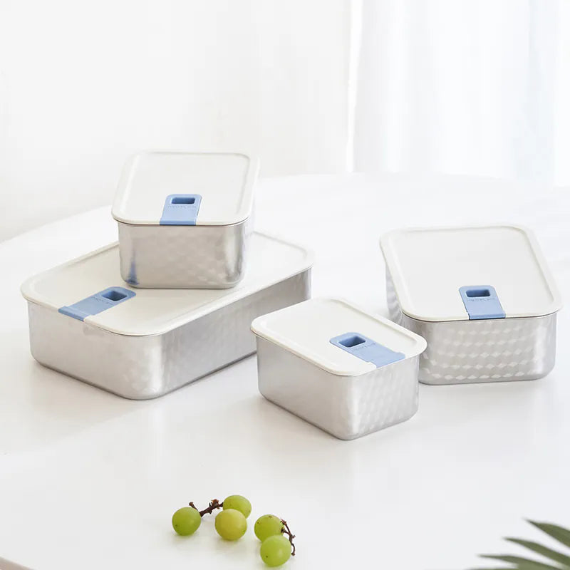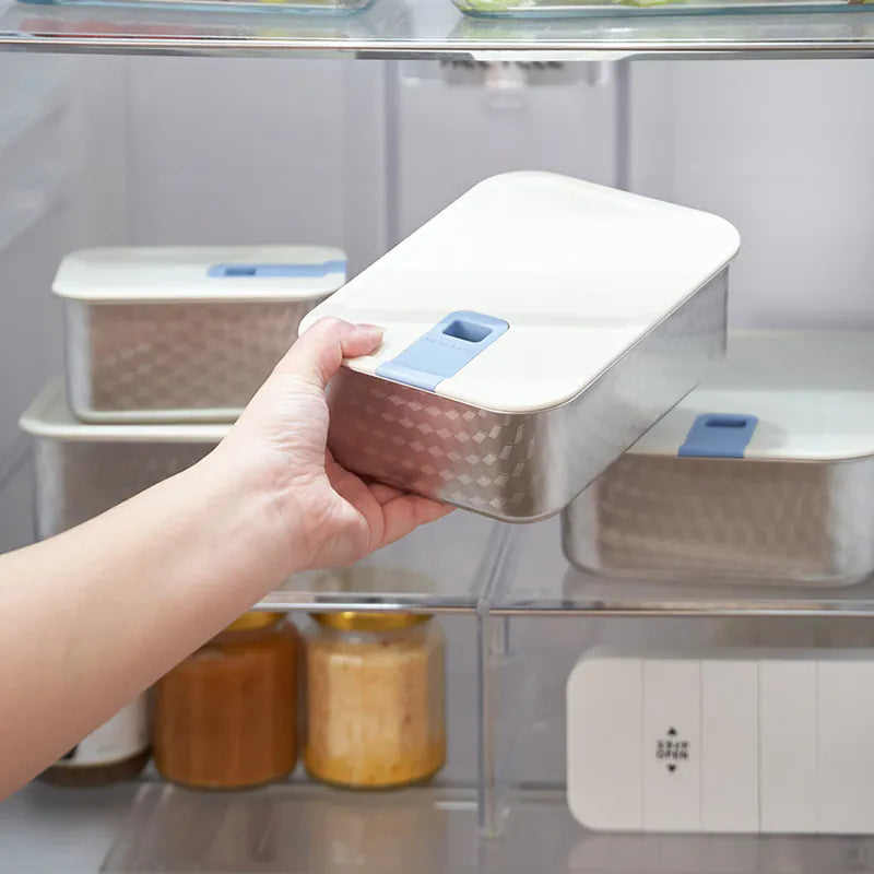 Blending Korean minimalist aesthetics, this container combines premium 304 stainless steel with heat-resistant glass for safe, even heating—microwaveable with the lid on. The matte haori pattern resists fingerprints, offering an elegant and refined look. Lightweight yet durable, it’s easy to carry without fear of breaking. Featuring a patented clasp-free lid, it opens effortlessly with a simple slide, press, and lift—designed for long-lasting use. The entire series stacks neatly to save fridge space, bringing ease and elegance to every mealtime.