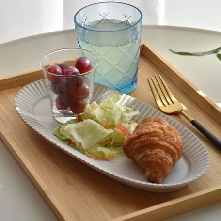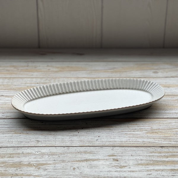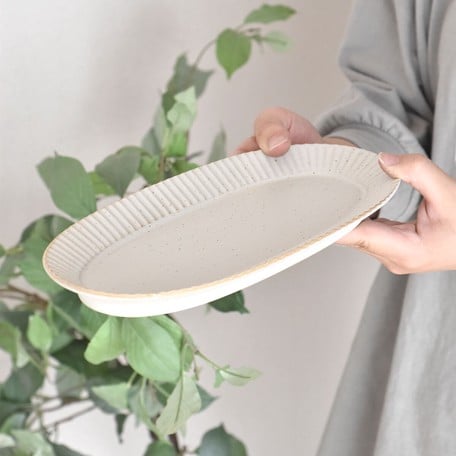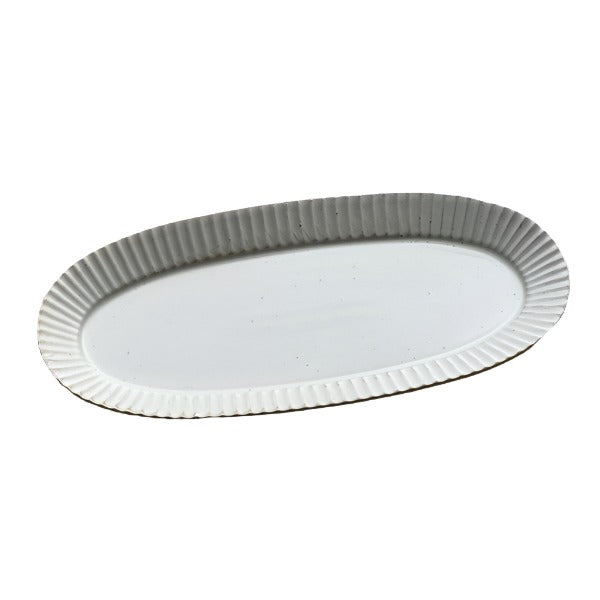 This long oval plate with a matte texture is very suitable for all kinds of fish dishes, barbecue steaks, or party refreshments. With the simple and stylish engraved patterns, the edge of the plate is outwardly slanted, which better brings out the texture and color of the food. The beige color is elegant and soft, and it will easily catch your eyes from your dining table.