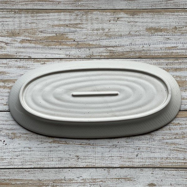 此款具有啞光質感的橢圓長盤,非常適合盛裝各種魚料理、烤肉排類或是派對茶點。外向傾斜的盤緣,簡潔整齊的雕刻條紋圖案,配上優雅柔和的米色,更好地襯托出食物的質感和色澤,成爲餐桌的焦點!