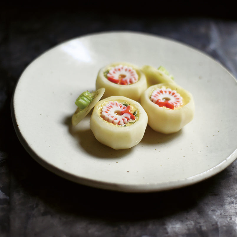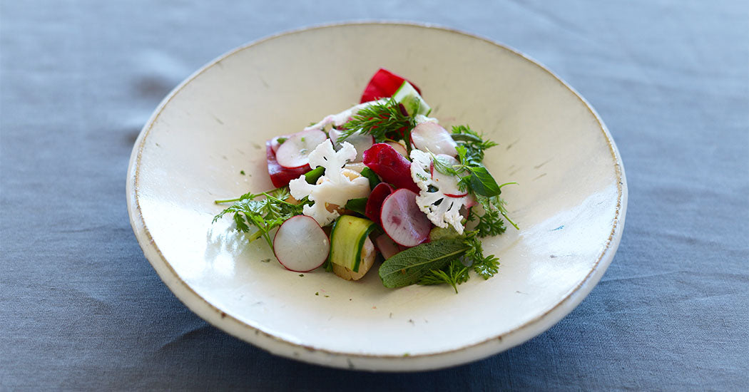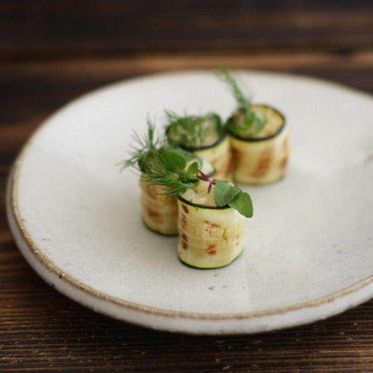 With the texture of the rough soil and the soft white atmosphere of the glaze on top, this plate presents a feeling of strength and gentleness. It uses "tatara" technique, and the irregular shape is hand-crafted, which adds the natural atmosphere and warmth to the plate. Available in three sizes with a little depth, it can be used both as a plate and a bowl. With full of elements that make the food stand out, this beautiful plate goes well with all kinds of cuisine.