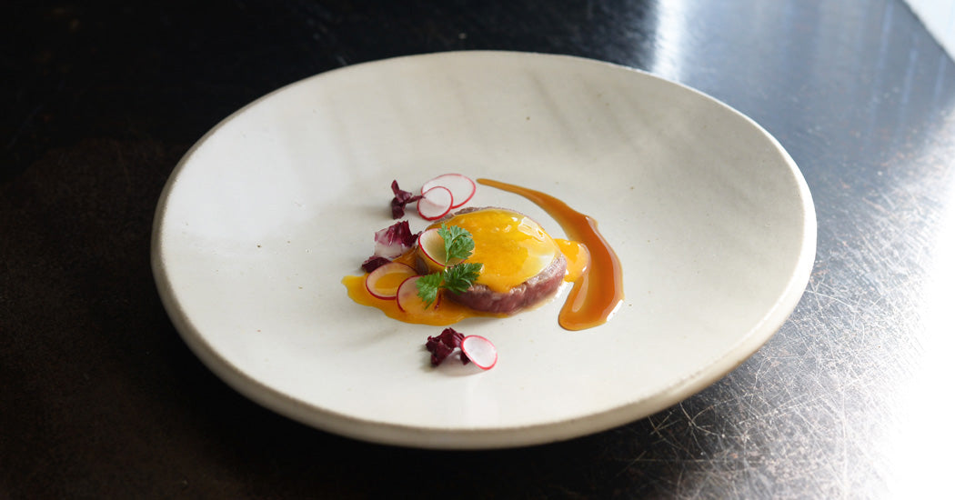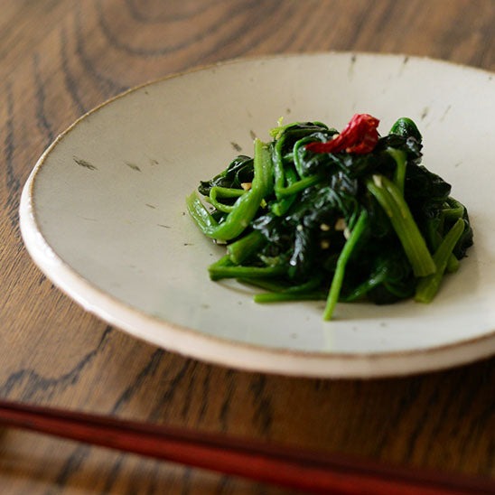 藉由荒土質感與施加的釉藥,呈現出柔和的白色氣氛,白唐津落落大方的氣質,讓人一眼愛上。使用「tatara 成形」技法打造,以手工製作的不規則感,取代機械式的冰冷線條,處處皆能感受到職人的精妙工藝,與器皿散發的自然氣息。共有三款大小,帶有一點深度,可盛裝有湯汁或勾芡的餐點。10.5" 大盤適合一群人聚餐時盛裝大份量料理,9.5" 可用作早餐的單盤料理,8.5" 則能盛裝燒烤料理或是小份的主菜,讓盤中食物瞬間升級!