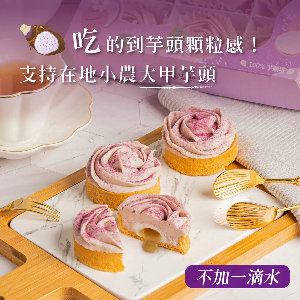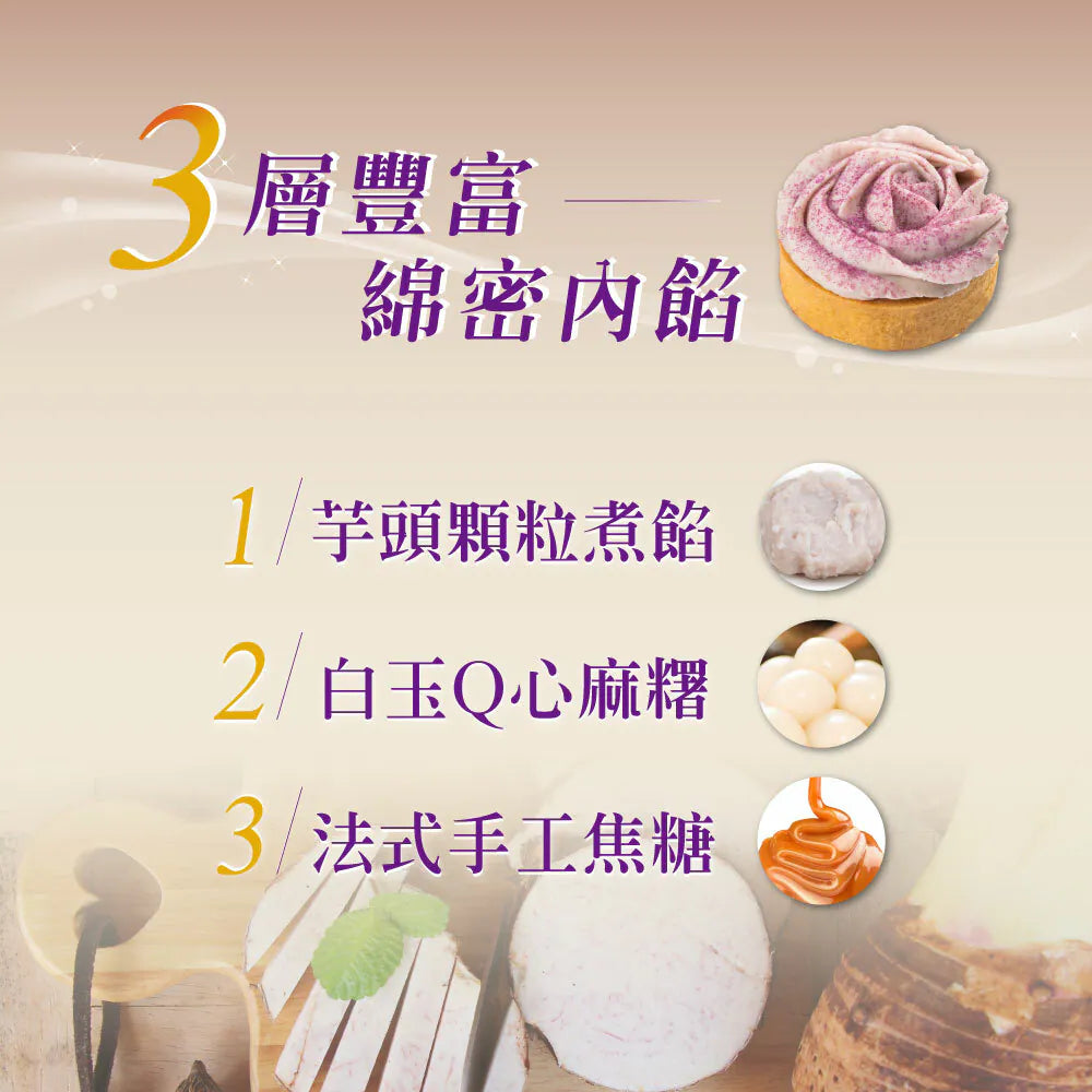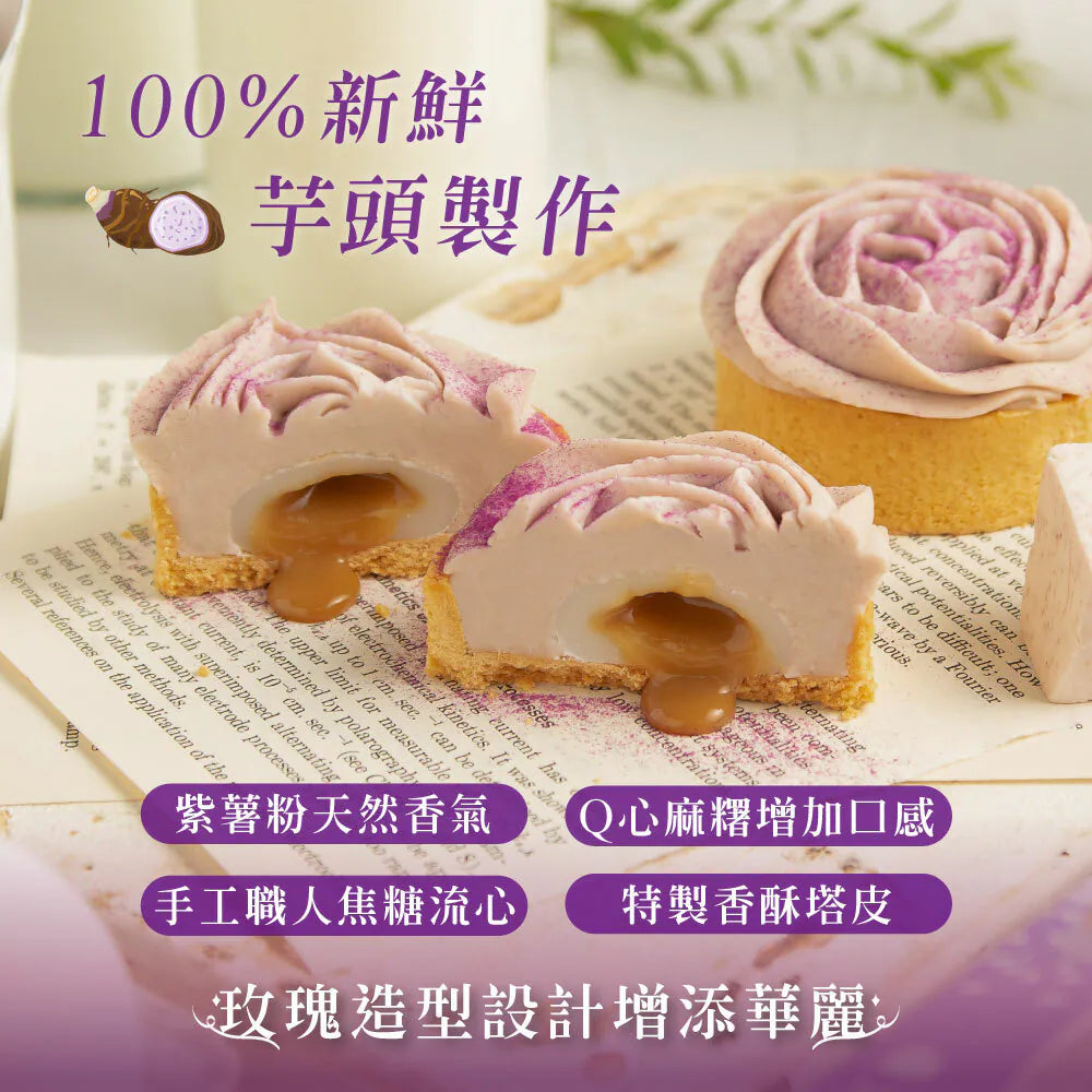 每口都吃的到濃濃芋頭香氣,手工職人焦糖流心 ,三層豐富綿密內餡,酥酥脆脆的奶油香塔殼,100%天然原色不添加人工色素,季節限定不能錯過