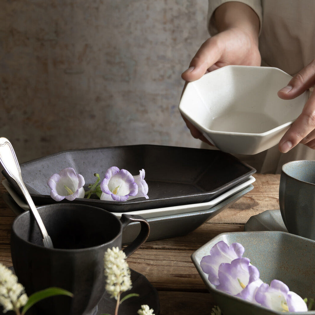 此古陶系列將現代生活方式與石器的堅固土壤相融合,同時具有古董藝術的細節,再結合特別的炻器土高溫燒製而成,高强緊密,實用性極高。外擴的八角形狀,配上渾厚天然的色澤,無論是柔和溫暖的白色,鐵鏽感的灰綠色,還是金屬感的黃銅黑色,每一個都有著獨特的魅力,適合搭配各式食材,爲你的餐桌創造出不一樣的風景!